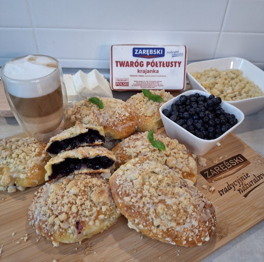 Następnie ciasto dzielimy na 12 równych porcji (po ok 90 g). Każdą spłaszczamy na placek. Następnie wkładamy go do małej miseczki (rolka). Do środka wsypujemy czubatą łyżkę jagód i sklejamy w podłużną bułeczkę. Bułki układamy na blaszce wyłożonej papierem do pieczenia, zlepieniem do dołu. Każdą smarujemy doztrzepanym jajkiem i posypujemy kruszonką 👌Bez kruszonki bułeczki również super smakują. Wystarczy po upieczeniu posmarować jagodzianki lukrem lub posypać cukrem pudrem.